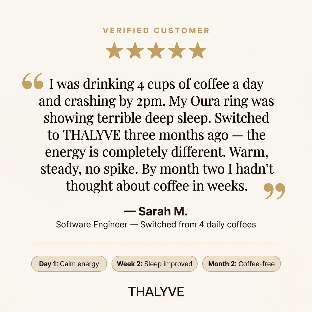 Day 1: You'll feel the warm, calm energy within 1-2 hours of your first cup. Week 1: Sharper focus, steadier energy, better sleep quality. Month 1: Coffee dependency significantly reduced or eliminated. Month 3+: Cumulative cardiovascular and wellness benefits build. This is a foundation, not a quick fix — it gets better with time.